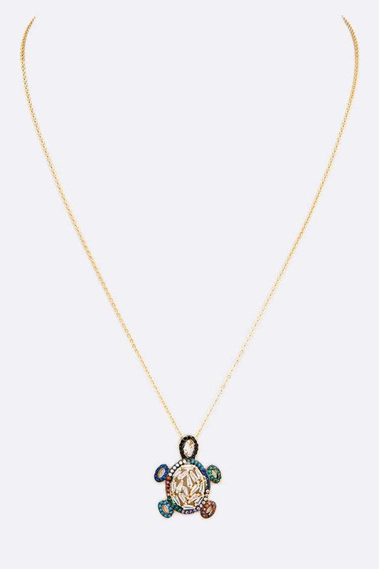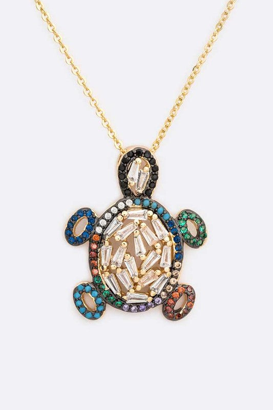 14K Gold Plated Sea Turtle Pendant Necklace - Baguette CZ Cubic Zirconia