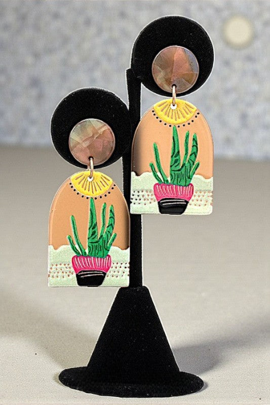 Bring a playful touch of the Wild West to your look with these charming cactus pot drop earrings. Vibrant and eye-catching, each earring features a colorful potted cactus design that adds personality and whimsy to any outfit.