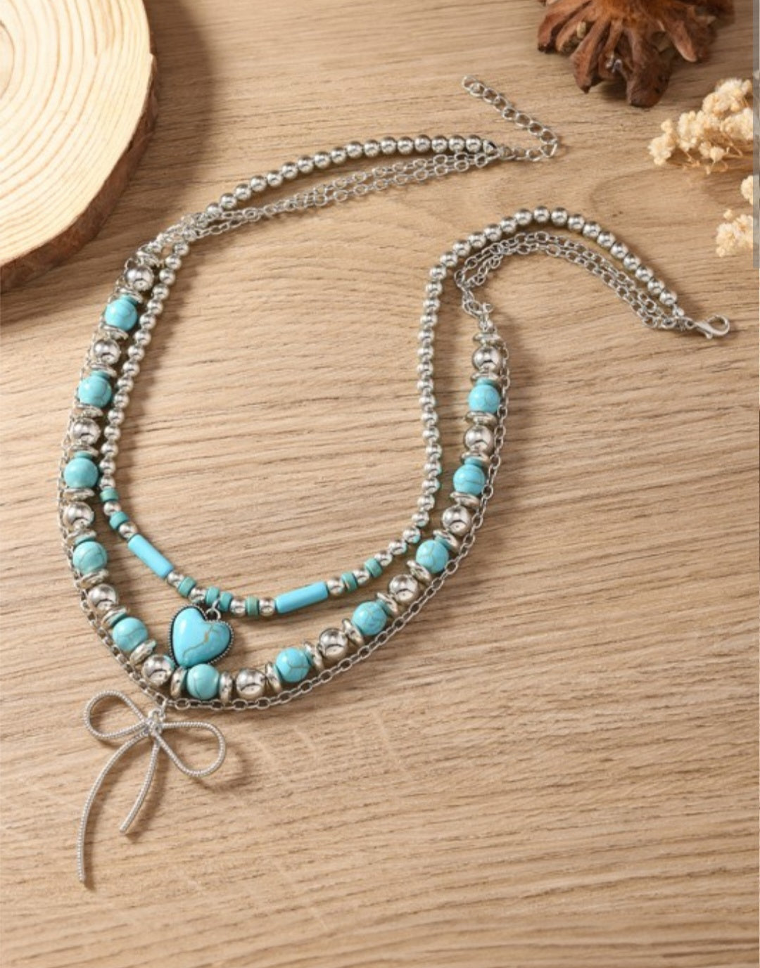 Some necklaces are just accessories. This one? It's a love letter to your personal style. The Western Turquoise Multi-Layer Necklace combines delicate bows, sweet hearts, and vibrant turquoise beading in a perfectly layered design that captures both feminine charm and western spirit. This is the necklace you'll reach for when you want to feel effortlessly put-together and undeniably you.