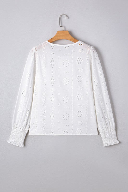 Embrace effortless femininity with this Eyelet Embroidered Smocked Cuff Blouse, where delicate craftsmanship meets versatile style. The crisp white cotton features intricate eyelet embroidery that adds texture and visual interest, while charming puff sleeves and smocked cuffs create a romantic silhouette that's both flattering and comfortable. This is the blouse you'll reach for again and again—from office meetings to weekend brunch and everything in between.