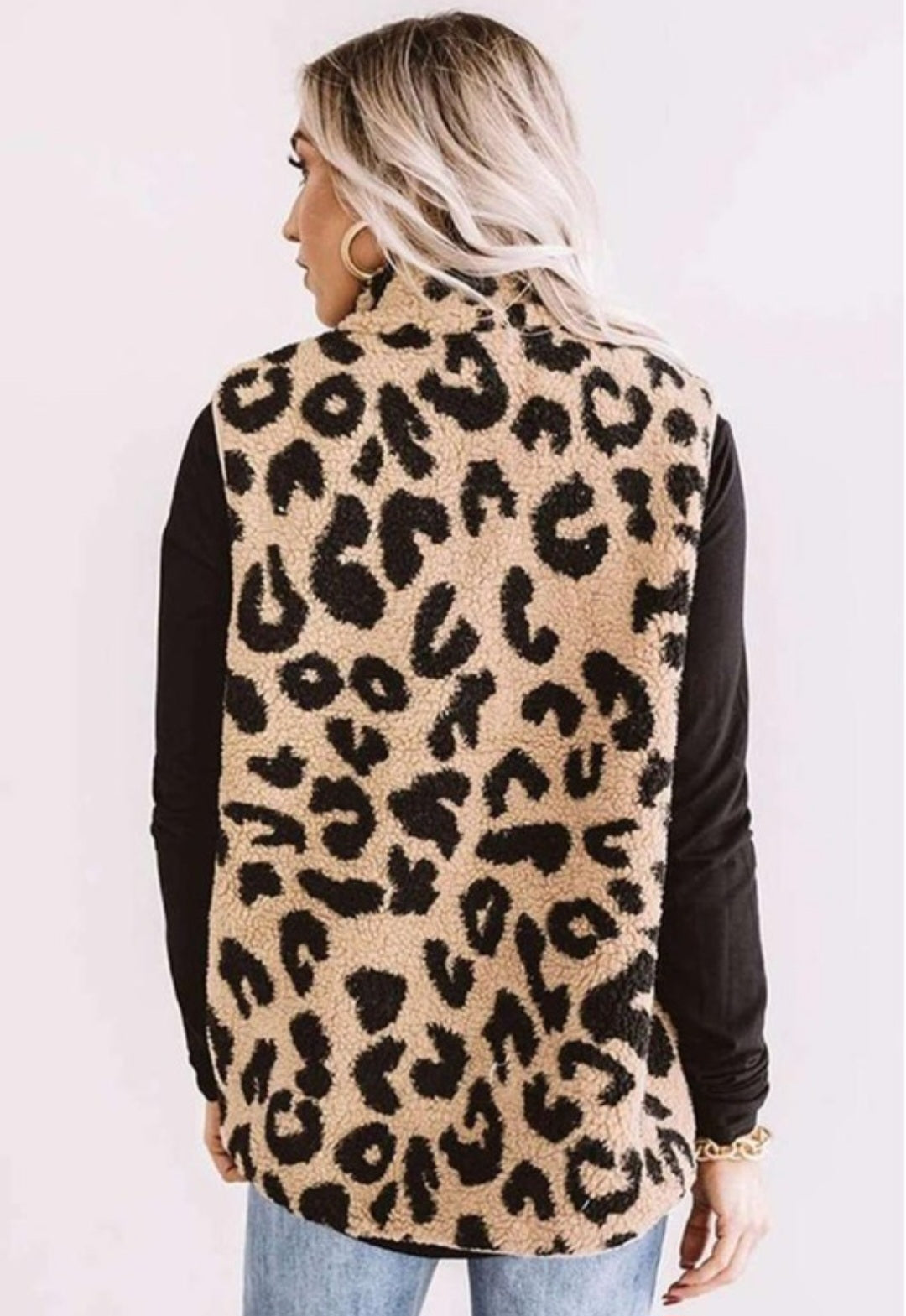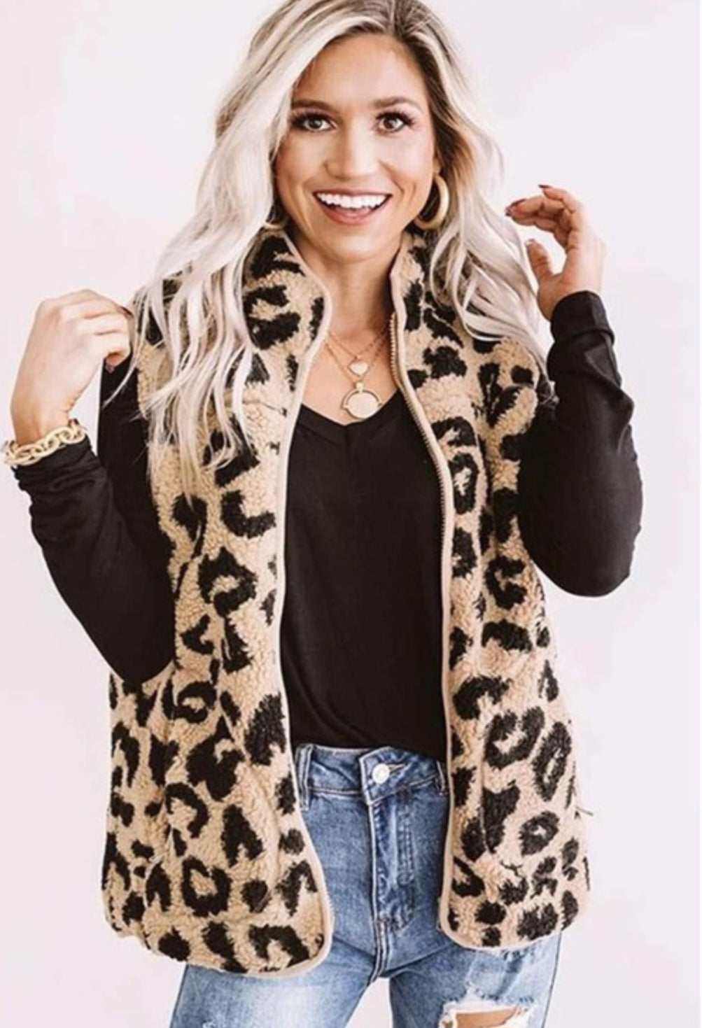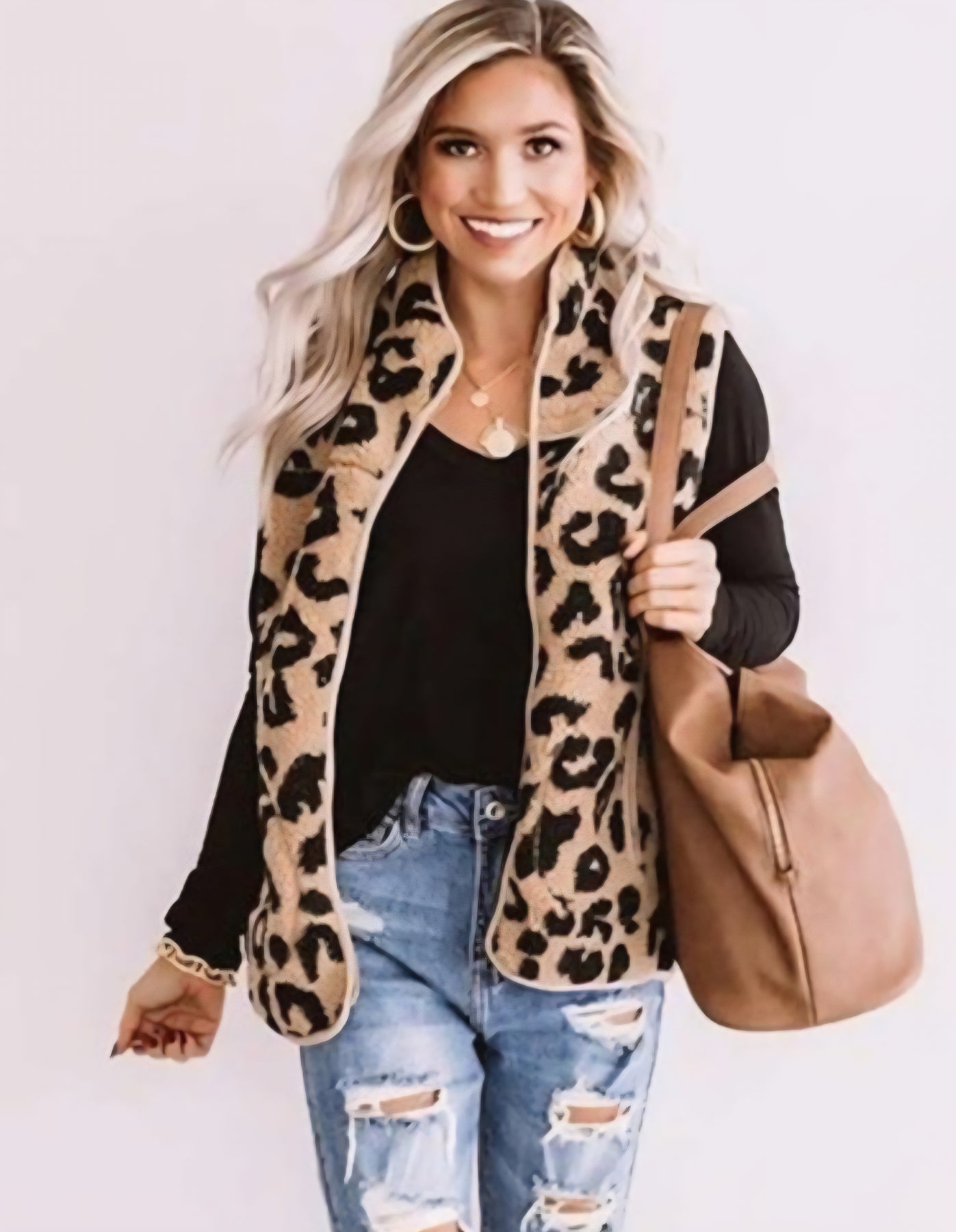Sherpa Leopard Print Vest | Faux Fur Fleece Zip Front