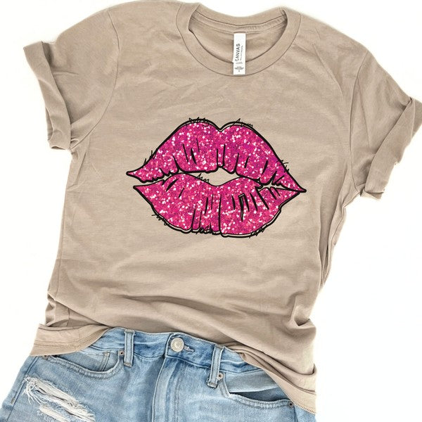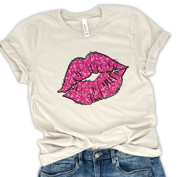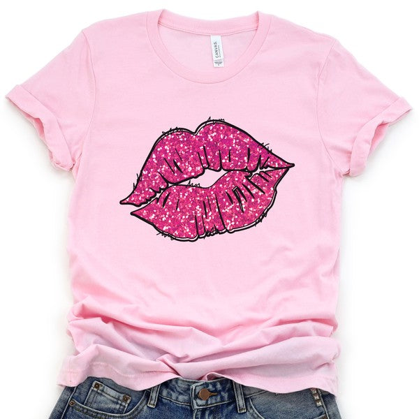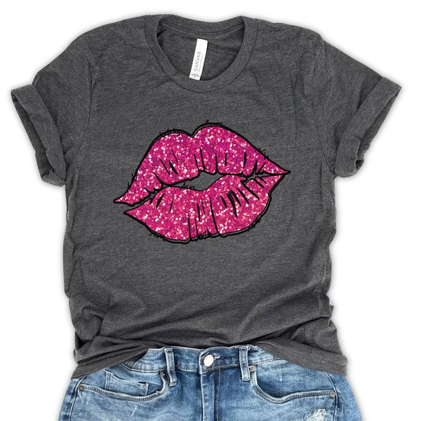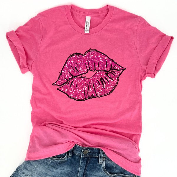 Luscious Lips (faux sparkle effect) Valentine's Day crewneck top. Wear this tee and celebrate February as the season of date night, hugs, kisses, sharing chocolate covered cherries, romance, XOXO, winking, perfume, pink and red lipstick, and playful flirting. T-shirts are lightweight, comfy, and feature a relaxed, unisex fit.