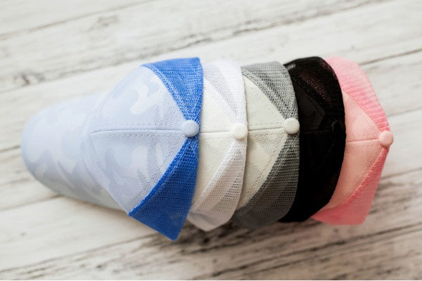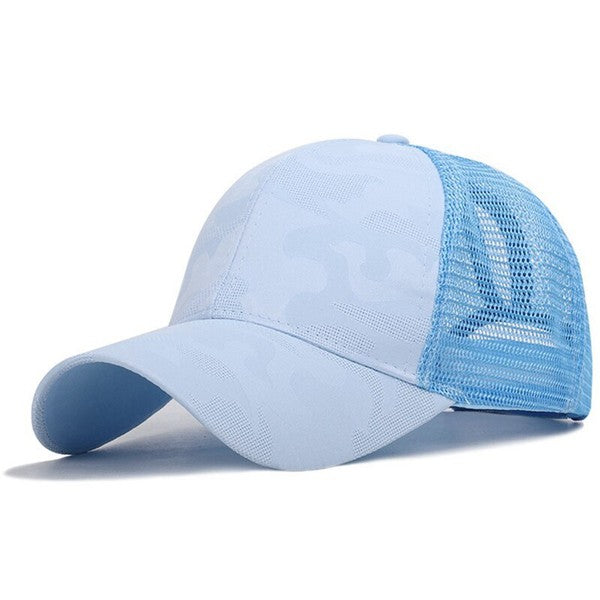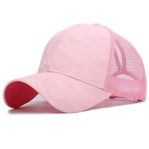 Style:Structured baseball cap with ponytail opening Pattern:Light camo blend Closure:Adjustable snapback Back:Breathable mesh
