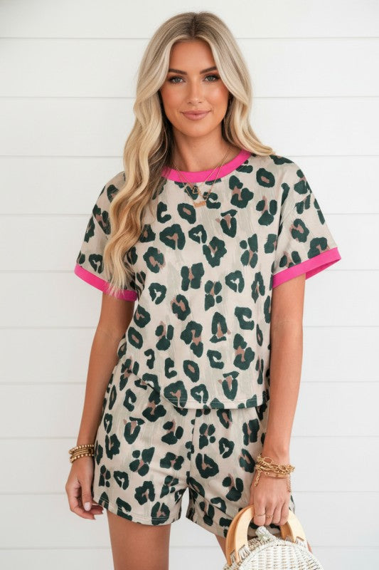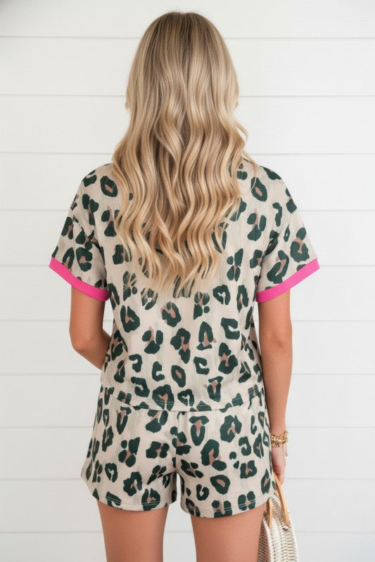 Brown Leopard Print Lounge Set - Contrast Trim Top & High Waist Shorts